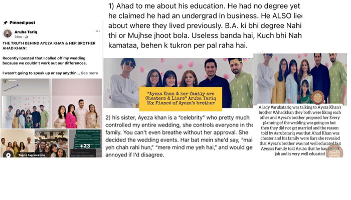 سوشل میڈیا پلیٹ فارم فیس بک پر عروبہ طارق نامی خاتون نے خود کو احد کی سابقہ منگیتر کہتے ہوئے عائزہ خان اور ان کے خاندان پر الزامات عائد کیے، اس پوسٹ پر لگائے گئے الزامات کے اسکرین شاٹس سوشل میڈیا پر تیزی سے وائرل ہو رہے ہیں۔