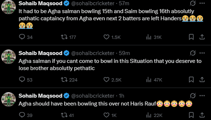 ایکس پر اپنی پوسٹ میں صہیب مقصود نے بھی سلمان علی آغا کی کپتانی پر شدید تنقید کی۔