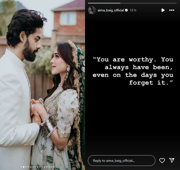 انسٹا اسٹوری میں آئمہ بیگ نے لکھا کہ ’ تم اہم ہو، تمہاری اہمیت ہمیشہ سے ہے، ان دنوں میں بھی، جب تم یہ بھول گئے‘۔