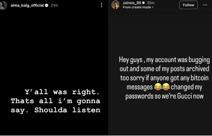 زین احمد نے وضاحتی انسٹا اسٹوری شیئر کرتے ہوئے مداحوں کو بتایا کہ ’میرا اکاؤنٹ کچھ دنوں سے بگ کررہا تھا جس کی وجہ سے میری کچھ پوسٹس آرکائیو ہوگئیں، اگر کسی کو بٹ کوائن کے پیغامات موصول ہوئے ہوں تو معذرت، میں نے پاس ورڈز تبدیل کردیے ہیں، اب سب کچھ نارمل ہے‘۔