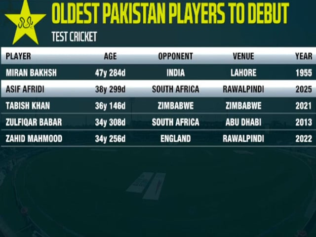 راولپنڈی(قدرت روزنامہ)آصف آفریدی 38 سال اور 299 دن کی عمر میں پاکستان کی جانب سے ٹیسٹ ڈیبیو کرنے والے دوسرے سب سے عمر رسیدہ کھلاڑی بن گئے ہیں۔