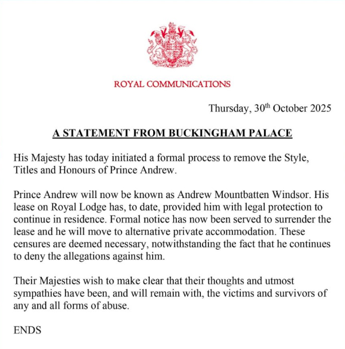 بکنگھم پیلس کے اعلامیے میں کہا گیا ہےکہ پرنس اینڈریو کو اب اینڈریو ماؤنٹ بیٹن ونڈسر کے نام سے جانا جائے گا اور انہیں ‘پرنس’ کے لقب سے نہیں پکارا جائے گا، اب وہ شاہی رہائش گاہ رائل لاج سے منتقل ہو کر نجی رہائش اختیار کریں گے۔