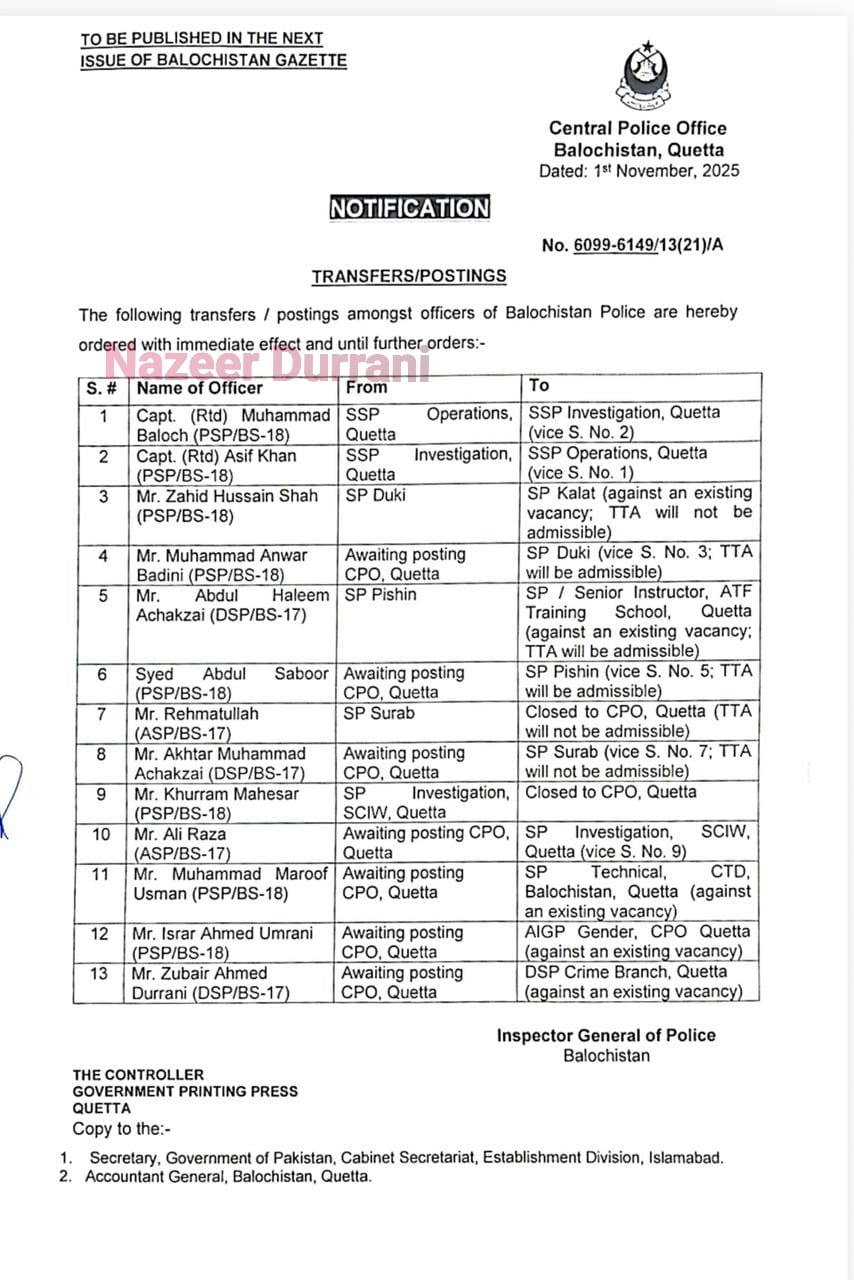 تمام تبادلے اور تقرریاں *انسپکٹر جنرل پولیس بلوچستان* کے احکامات پر *فوری اثر* کے ساتھ نافذ کر دی گئی ہیں۔
