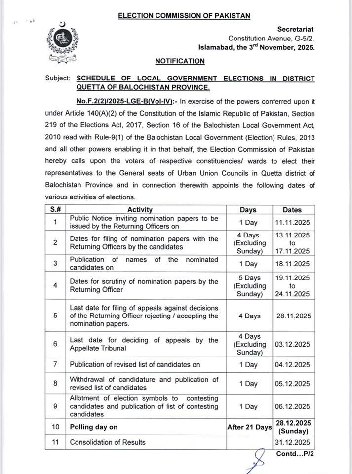کوئٹہ(قدرت روزنامہ)الیکشن کمیشن آف پاکستان (ای سی پی) نے آئینی اور قانونی اختیارات کا استعمال کرتے ہوئے، ضلع کوئٹہ کی اربن یونین کونسلز کی جنرل نشستوں پر بلدیاتی انتخابات کے لیے شیڈول کا اعلان کر دیا ہے۔ ای سی پی کے نوٹیفکیشن کے مطابق، انتخابات کا عمل 11 نومبر 2025 کو ریٹرننگ آفیسرز کے ذریعے کاغذات نامزدگی کے لیے پبلک نوٹس جاری ہونے سے شروع ہوگا، جبکہ امیدوار 13 نومبر سے 17 نومبر تک کاغذات جمع کرا سکیں گے۔