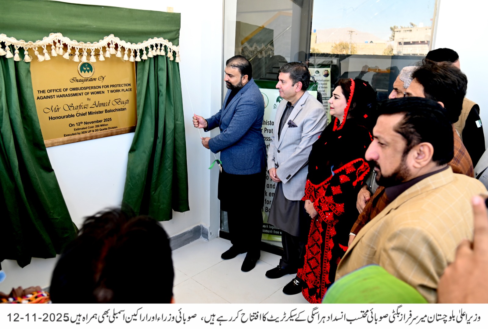 اس موقع پر صوبائی وزراء میر شعیب نوشیروانی، بخت محمد کاکڑ، پارلیمانی سیکرٹریز میر برکت رند اور حاجی ولی محمد نورزئی بھی موجود تھے قبل ازیں وزیر اعلیٰ بلوچستان میر سرفراز بگٹی نے صوبائی محتسب انسداد ہراسگی کے نئے ڈائریکٹوریٹ کا افتتاح بھی کیا۔