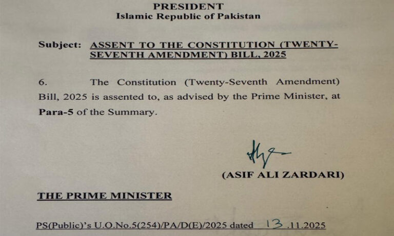 اسلام آباد(قدرت روزنامہ) صدرِ مملکت آصف علی زرداری نے 27ویں آئینی ترمیم بل پر دستخط کر دیے ہیں، جسے قومی اسمبلی اور سینیٹ دونوں ایوانوں سے منظوری کے بعد صدارتی توثیق کے لیے بھیجا گیا تھا۔