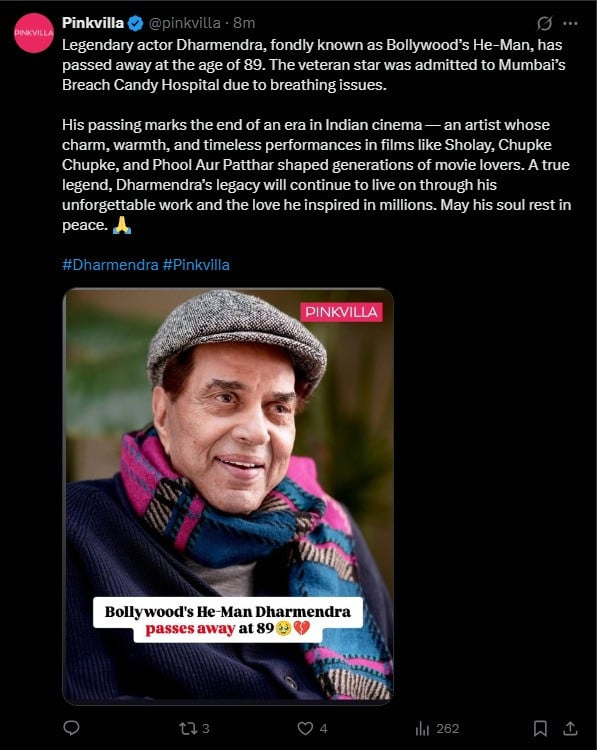 بھارتی میڈیا نے دعویٰ کیا ہے کہ دھرمیندر 24 نومبر کو طویل علالت کے بعد 89 برس کی عمر میں چل بسے۔