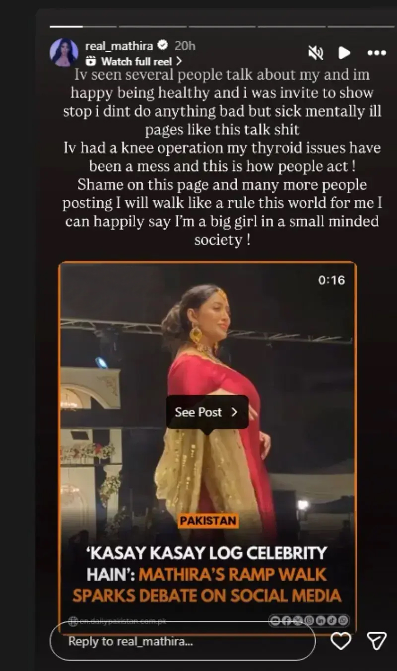 لاہور (قدرت روزنامہ)پاکستان کی معروف ماڈل، اداکارہ اور ٹی وی میزبان متھیرا نے حال ہی میں ایک فیشن شو میں اپنی ریمپ واک پر ہونے والی تنقید کا بھرپور جواب دیا ہے۔