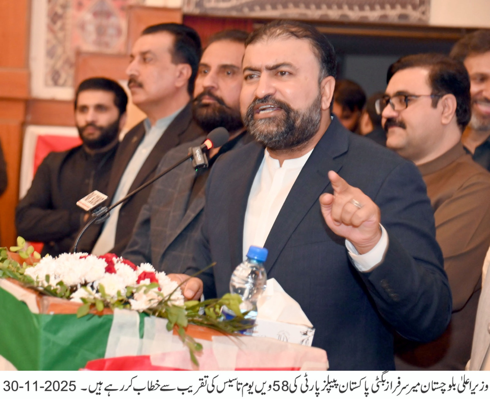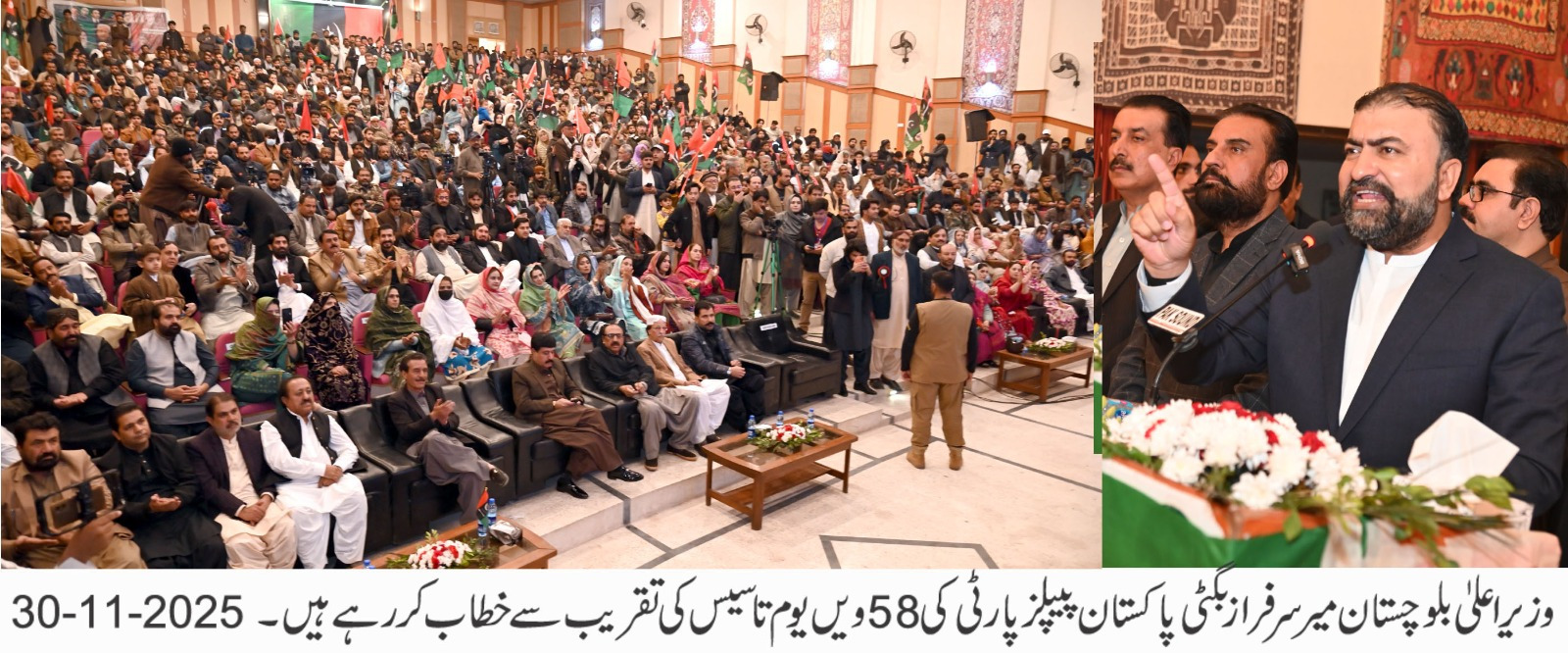 کہ دہشت گردی اور انتشار کے خلاف ریاست اور عوام ایک ساتھ متحد رہیں گے وزیر اعلیٰ نے بتایا کہ کوئٹہ کے سریاب روڈ پر واقع شہید ذوالفقار علی بھٹو کا تاریخی گھر جس پر ایک سرکاری محکمے نے قبضہ کر رکھا تھا صوبائی حکومت نے واگزار کرا لیا ہے صدرِ مملکت آصف علی زرداری سے اس گھر کو پارٹی کے ایک شہید کے نام کرنے کی اجازت مانگی جو منظور کر لی گئی ہے یہ گھر 18 اکتوبر کے شہید خلیل احمد سمالانی کے خاندان کو دیا جا رہا ہے جہاں ان کی والدہ رہائش پذیر ہوں گی انہوں نے کہا کہ یہ فیصلہ شہداء کی قربانیوں کے اعتراف اور پارٹی وفاداری کے احترام کی ایک مثال ہے اپنے خطاب میں وزیر اعلیٰ بلوچستان نے کہا کہ ہم نے انتہائی ناموافق حالات میں حکومت سنبھالی۔ جب حکومت بنی تو ریڈ زون بند تھا عوام مشکلات و مصائب کا شکار تھے ہماری حکومت نے لوگوں کو ان کا آئینی حق دلانے اور ریاستی اداروں تک رسائی ممکن بنانے کے لیے جرأت مندانہ فیصلے کئے انہوں نے کہا کہ صوبائی حکومت دن رات محنت کر رہی ہے آپ سے وعدہ ہے کہ ہم آپ کو مایوس نہیں کریں گے ہم عوام کی توقعات پر پورا اتریں گے اور بلوچستان کو امن، ترقی اور خوشحالی کی راہ پر لے کر جائیں گے تقریب کے اختتام پر وزیر اعلیٰ بلوچستان نے پارٹی رہنماؤں کے ہمراہ یومِ تاسیس کا کیک بھی کاٹا