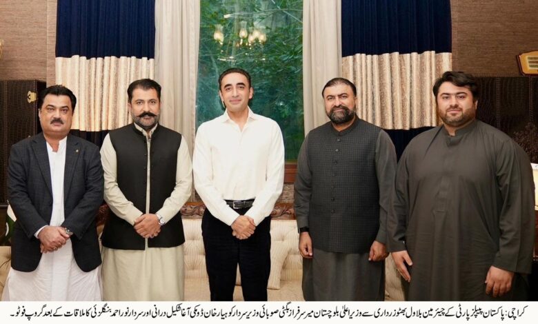 پاکستان پیپلز پارٹی کے چیئرمین بلاول بھٹو زرداری سے وزیر اعلیٰ بلوچستان میر سرفراز بگٹی اور صوبائی رہنماؤں کی ملاقات، بلوچستان کی مجموعی سیاسی صورتحال، صوبائی معاملات اور مستقبل کی سیاسی حکمت عملی پر تفصیلی تبادلہ خیال