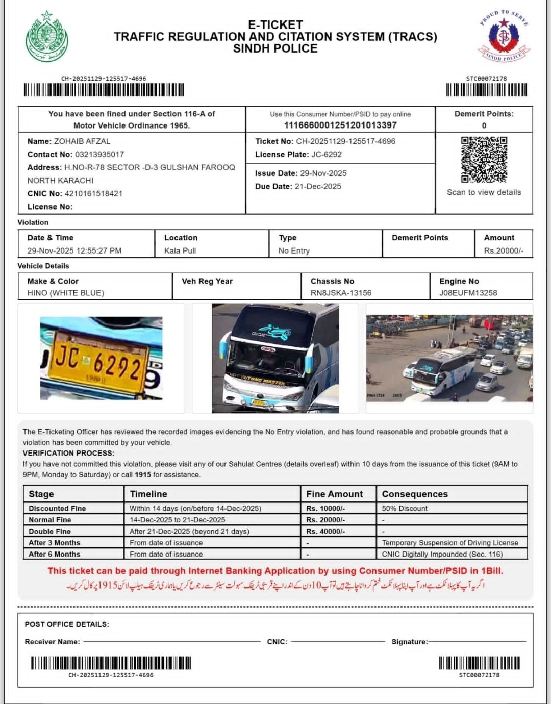 رجمان ٹریفک پولیس کے مطابق وہ تمام انٹرسٹی بسیں جو سہراب گوٹھ بس ٹرمینل یا کراچی بس ٹرمینل کے قواعد کے خلاف ورزی کرتے ہوئے براہ راست شہر میں داخل ہوتی ہیں ان کے خلاف ای ٹکٹ جاری کیا جا رہا ہے۔