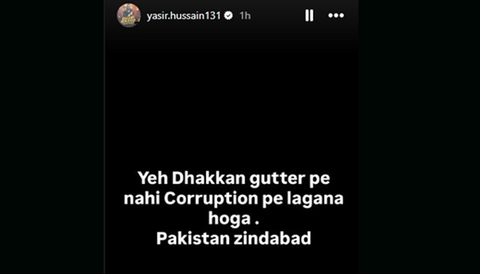 ہدایتکار یاسر حسین نے بھی انسٹاگرام پر اسٹوری اپ لوڈ کرتےہوئے لکھا کہ ‘ یہ ڈھکن گٹر پر نہیں، کرپشن پر لگانا ہوگا، پاکستان زندہ باد’۔