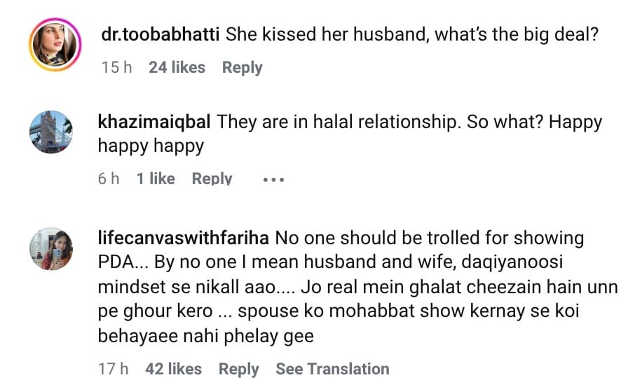 نوجوان طبقہ حنا نیازی کی حمایت کرتا دکھائی دیا اور ان کا کہنا تھا کہ انہوں نے اپنے شوہر کو بوسہ دیا، اس میں کوئی برائی نہیں۔
