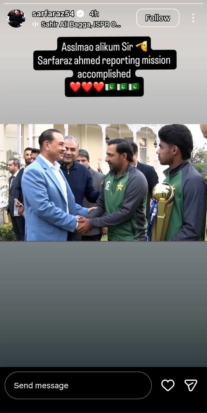 مایہ ناز سرفراز احمد نے اپنے انسٹاگرام اکاؤنٹ پر ایک تصویر شیئر کی جس میں وہ انڈر‑19 ٹیم کے ساتھ جنرل ہیڈ کوارٹرز میں فیلڈ مارشل عاصم منیر سے ملتے ہوئے نظر آ رہے ہیں۔