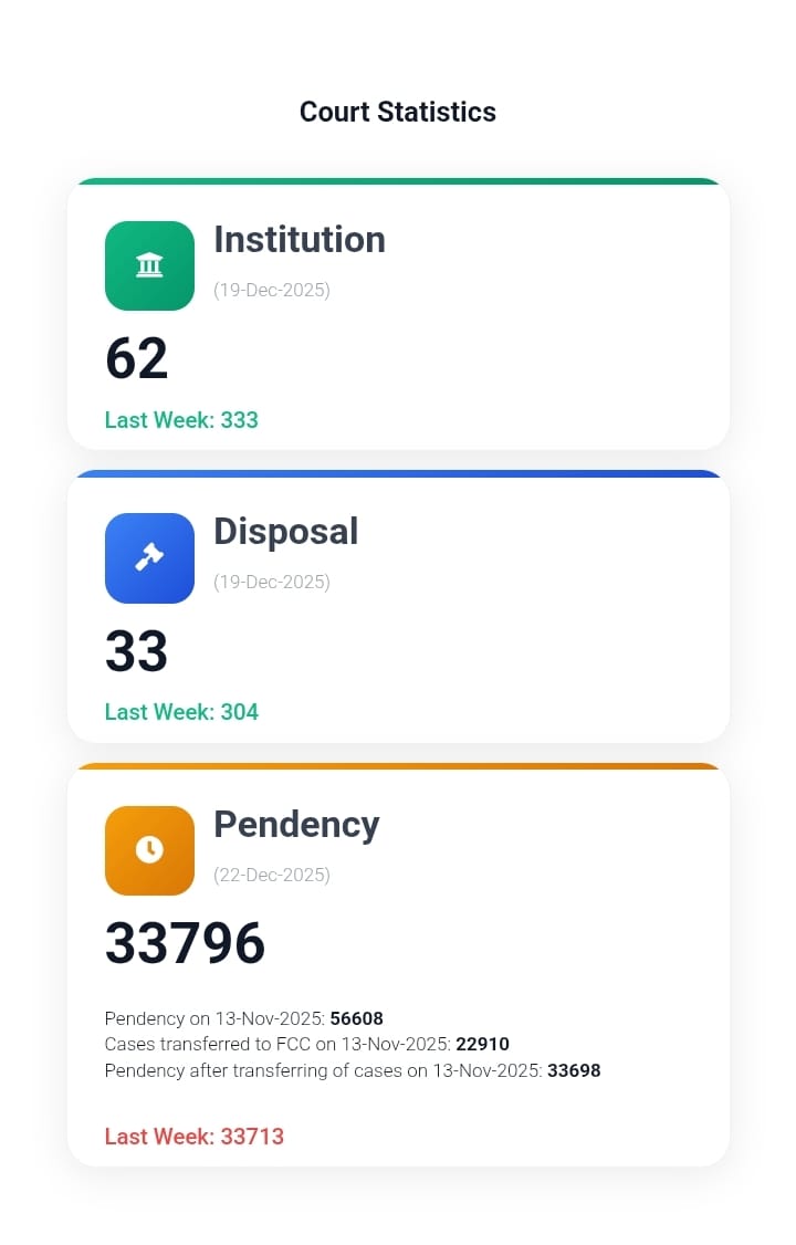 اعداد و شمار کے مطابق عدالت عظمیٰ میں زیرِ التوا مقدمات کی تعداد کم ہو کر 33 ہزار 796 رہ گئی ہے، جبکہ 13 نومبر تک سپریم کورٹ میں 56 ہزار 608 مقدمات زیرِ التوا تھے۔
