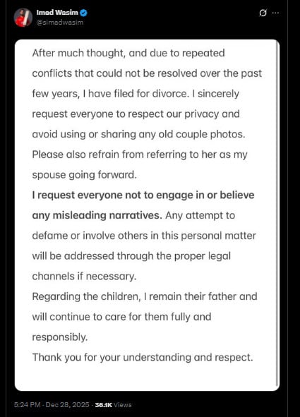سماجی رابطے کی ویب سائٹ پر جاری بیان میں عماد وسیم نے کہا کہ ‘طویل سوچ وبچار اور مسلسل اختلافات، جو گزشتہ چند برسوں سے حل نہیں ہوسکے، کے بعد میں نے طلاق کے لیے کیس دائر کردیا ہے’۔