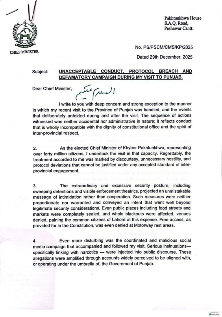 وزیر اعلیٰ کے پی کے سہیل آفریدی نے خط میں لکھا کہ دورہ پنجاب میں میرے ساتھ نامناسب رویہ اختیار کیا گیا، پنجاب میں دورے کے دوران میرے ساتھ نامناسب رویہ اور بدتمیزی کی گئی۔