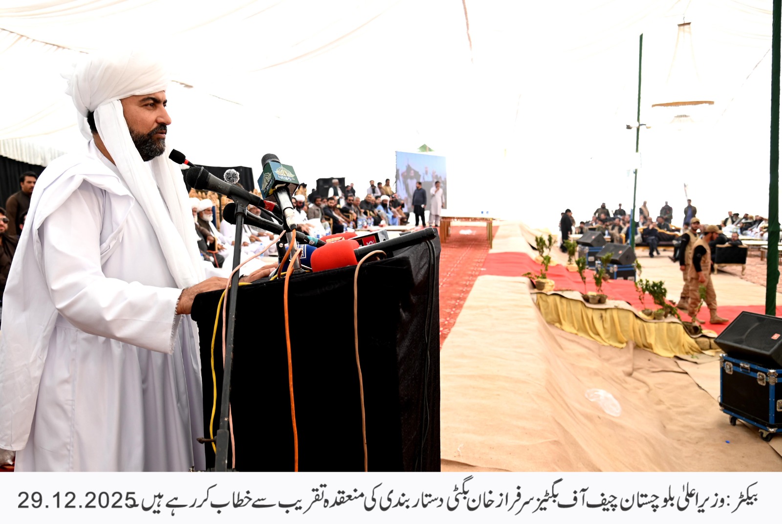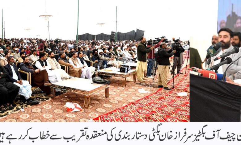 بلوچ کبھی تشدد کے ذریعے اپنے مقاصد حاصل نہیں کر سکتے انہوں نے واضح کیا کہ ہمارا جینا مرنا پاکستان کے ساتھ تھا اور ہمیشہ رہے گا انہوں نے کہا کہ میں عوام کو میں پیغام دینا چاہتا ہوں بالخصوص ان بلوچ بھائیوں کو جو بلوچ بھائی آج پہاڑوں پہ مذاحمت کا راستہ اپنائے ہوئے ہیں میں ان سے یہ گزارش کرتا ہوں کہ آپ کو ایک لاحاصل جنگ میں ڈالا گیا ہے جس میں آپ کو کشت وخون کے سوا کچھ حاصل نہیں ہوگا بلوچ قوم اگر آج نہیں نہیں سوچے گی تو 40 سال بعد ان کو سوچنا پڑے گا لہذا میں ریاست کی جانب سے حکومت کی جانب سے یہ گزارش کر رہا ہوں کہ آپ واپس تشریف لے آئیں آپ پاکستان کے قومی ادارے میں شامل ہو جائیں بصورت دیگر ریاست کو اپنی رٹ اسٹیبلش کرنا آتی ہے انہوں نے کہا کہ عام لوگوں کو مزدوروں کو نہتے لوگوں کو مارنا ہماری روایت نہیں ہے پنجابی مزدوروں کو قتل کرنا خواتین کو ہراساں کرنا انجینیئرز اور ڈاکٹرز کو قتل کرنا ہماری روایات نہیں ہیں انہوں نے کہا کہ آج کا دن روایتوں کا دن ہے ہم بلوچ روایتوں کے امین لوگ ہیں ہم قطعاً اس کی اجازت نہیں دے سکتے کہ کوئی بندوق کے زور پہ اپنا نظریہ مسلط کرے رٹ آف سٹیٹ ہمیشہ قائم کرنی پڑتی ہے اور ہم رٹ آف سٹیٹ قائم کرنے کے لیے کوئی بھی کمی نہیں چھوڑیں گے اور بالخصوص بگٹی قبائل اور سرفراز بگٹی اس مظلوم عورت کے ساتھ کھڑے ہوں گے جس عورت کے سامنے موسیٰ خیل میں اس کے بیٹے اور شوہر کو گولیوں سے چھلنی کیا گیا انہوں نے واضح کیا کہ آپ مجھے ہمیشہ مظلوم کے ساتھ کھڑا پائینگے ظالم جہاں بھی ظلم کرے گا میں اس کے خلاف کھڑا ہوں گا اور مظلوم کے ساتھ کھڑا ہوں گا میرے والد مظلوم کے ساتھ کھڑے رہے ، میرے چچا مظلوم کے ساتھ کھڑے رہے میرا خاندان مظلوم کے ساتھ کھڑا رہا میں کبھی بھی ظالم کا ساتھ کسی صورت نہیں دے سکتا، قبل ازیں وزیر اعلیٰ بلوچستان میر سرفراز بگٹی نے اقوام بگٹی اور تقریب کے شرکاء سے بلوچی میں خطاب کیا