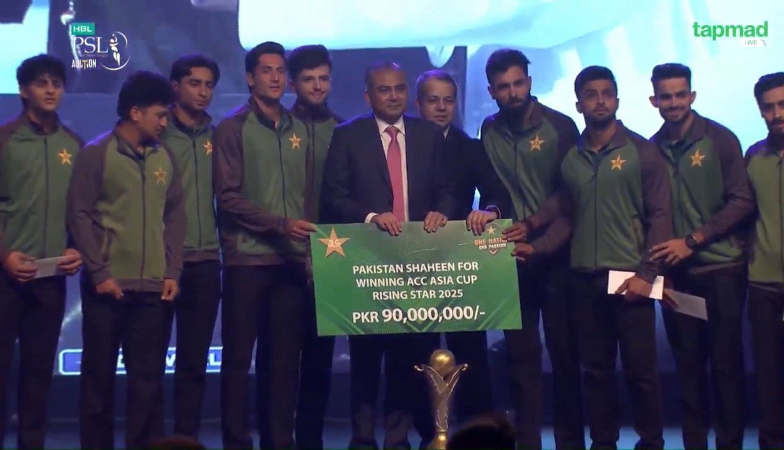 قبل ازیں تقریب کے آغاز پر چیئرمین پی سی بی محسن نقوی نے رائزنگ اسٹار ایشیا کپ جیتنے والی ٹیم کو 9 کروڑ روپے کی انعامی رقم دی۔