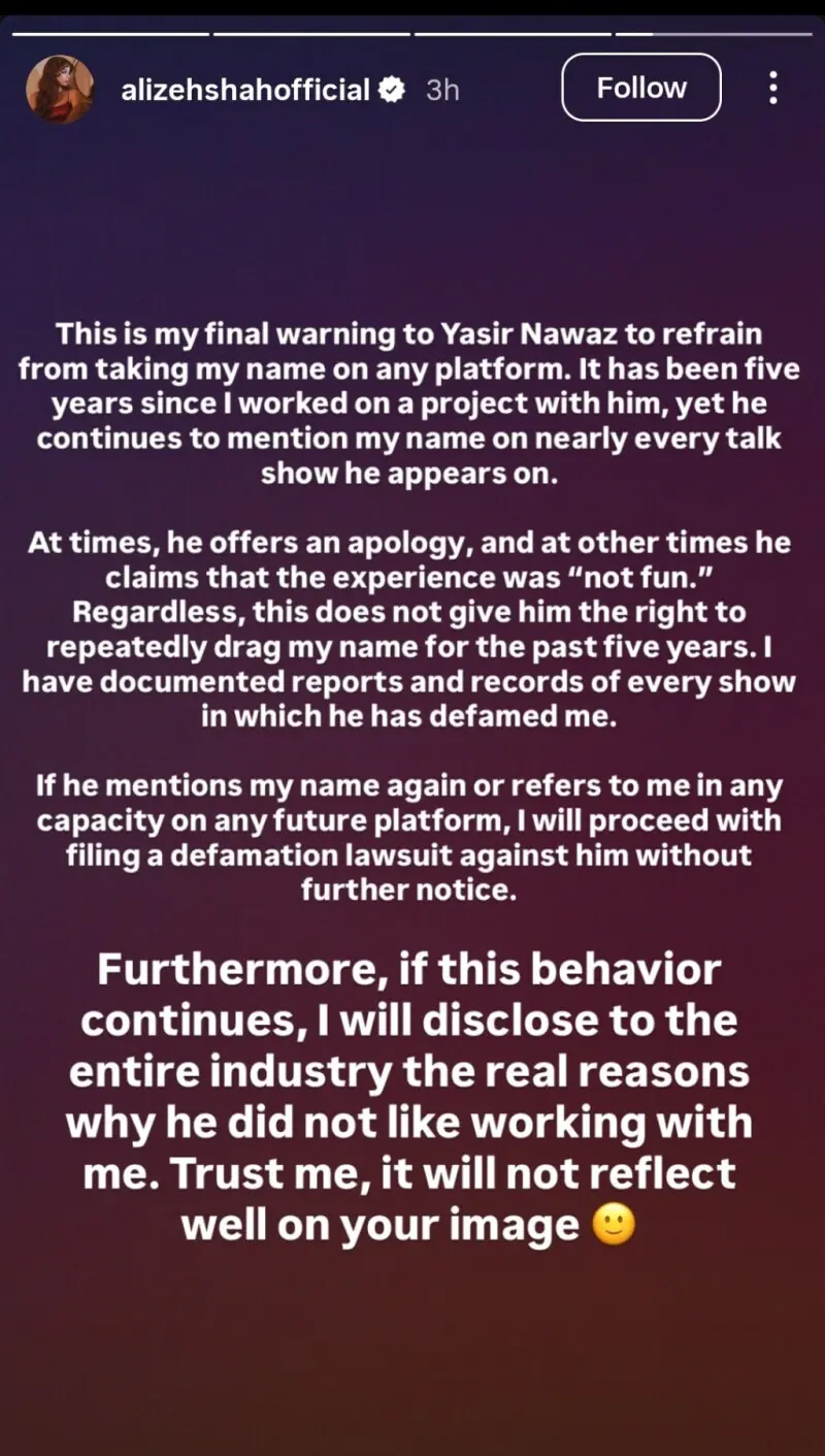 حال ہی میں علیزے شاہ نے انسٹاگرام پر ایک واضح اور سخت پیغام شیئر کرتے ہوئے یاسر نواز کو خبردار کیا کہ وہ آئندہ کسی بھی پلیٹ فارم پر ان کا نام لینے سے باز رہیں۔