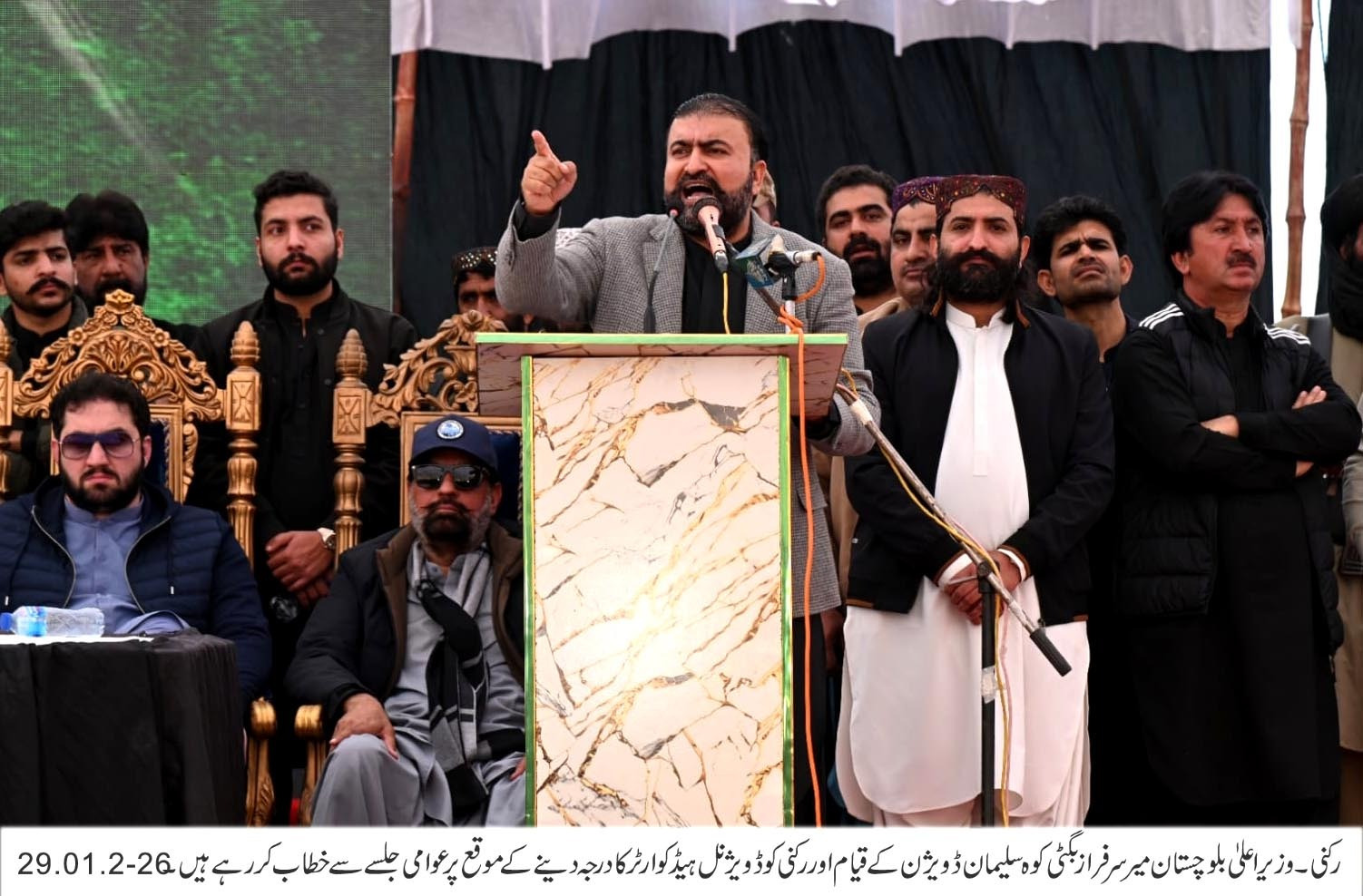 غیرت وراثت میں ملتی ہے لیکن ترقی کمائی جاتی ہے اور جو محنت سے بھاگ جائے وہ نام تو بنا سکتا ہے لیکن مقام نہیں یاد رکھو اگر ہاتھوں میں چھالے ہو تو تم درست سمت میں ہو اگر نیند قربان ہو تو جان لو کہ مستقبل تمہارا انتظار کر رہا ہے اے نوجوانوں قوم سیال سیال کے نعروں سے نہیں بنتی قوم کردار سے بنتی ہے یہ وقت ہے کہ تم قلم کو ہتھیار بناوعلم کو طاقت بناو اور محنت کو پہچان بناو کوئی تمہیں کمزور کہے کوئی تم پر بلاوجہ تنقید کرے تم مسکرا کر ایسا جواب دو کہ جیسے آج میں جواب دے رہا ہوں میں آپ سے کہنا چاہتا ہوں کہ اپنے کردار اور ارادوں کو اونچا اور مضبوط رکھو جلسے سے راکین صوبائی اسمبلی زرک خان مندوخیل ، حاجی علی مدد جتک ، پاکستان پیپلز پارٹی کے رہنما میر باز محمد کھیتران ، سابق صوبائی وزیر نصیب اللہ مری ، نیشنل پارٹی کے رہنما عبدالکریم کھیتران ، ڈسٹرکٹ چیئرمین ڈیرہ بگٹی وڈیرہ غلام نبی شمبانی، ضلع چیئرمین کوہلو میر نثار احمد مری اور زوکون قبیلے سے تعلق رکھنے والے سمیع خان زرکون نے بھی خطاب کیا اور وزیراعلیٰ کے اس احسن اور عوام دوست اقدام کو بھرپور سراہا انہوں نے کہا کہ تاریخ میں پہلی مرتبہ ایسا ہوا ہے کہ کسی یونین کونسل کو ڈویژنل ہیڈ کوارٹر کی حیثیت دی گئی ہے اور یقیناً اس کا سہرا وزیر اعلیٰ بلوچستان میر سرفراز بگٹی کو جاتا ہے۔