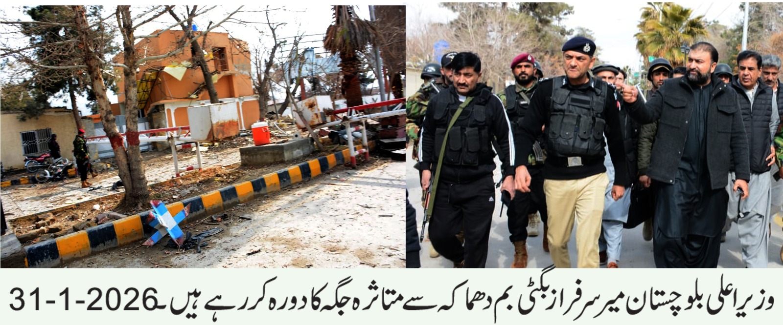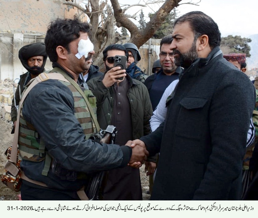 وزیر اعلیٰ بلوچستان نے دھماکے کے مقام پر سیکیورٹی فورسز، پولیس اور سی ٹی ڈی کے افسران و جوانوں سے ملاقات کی اور ان کی جرات، پیشہ ورانہ مہارت اور بروقت ردعمل کو سراہا اس موقع پر انسپکٹر جنرل پولیس بلوچستان محمد طاہر خان نے وزیر اعلیٰ کو واقعے سے متعلق تفصیلی بریفنگ دی جس میں سیکیورٹی انتظامات، جاری کارروائیوں اور مجموعی صورتحال سے آگاہ کیا گیا۔