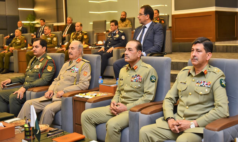 قبل ازیں نور خان ایئر بیس پر پہنچنے پر فیلڈ مارشل خلیفہ ابو القاسم حفتر کا استقبال فیلڈ مارشل سید عاصم منیر نے کیا۔