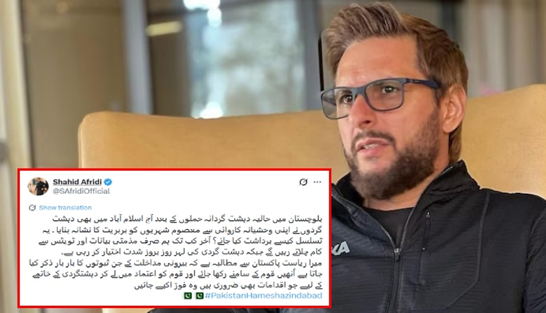 سوشل میڈیا پر جاری پیغام میں شاہد خان آفریدی نے کہا کہ بلوچستان میں حالیہ دہشت گردانہ حملوں کے بعد اسلام آباد میں بھی دہشت گردوں نے اپنی وحشیانہ کاروائی سے معصوم شہریوں کو بربریت کا نشانہ بنایا۔