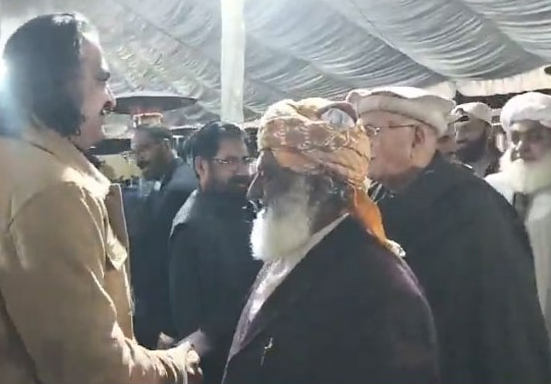 ا سلا م آ با د ، محمو د خا ن ا چکز ئی کے عشا یئے میں مو لا نا فضل ا لر حما ن ا و ر علی ا مین گنڈ ا پو ر کا آ منا سامنا ا یک د و سر ے سے معا نقہ بھی کیا