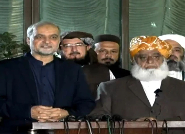 اسلام آباد (قدرت روزنامہ)جمعیت علمائے اسلام پاکستان کے سربراہ مولانا فضل الرحمان نے جماعت اسلامی پاکستان کے امیر حافظ نعیم الرحمان کے ہمراہ میڈیا سے گفتگو میں کہا ہے کہ عیدالفطر کے بعد پورے ملک میں عوامی مہم چلائی جائے گی۔