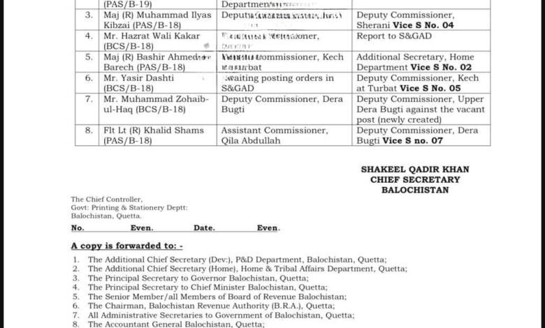 * فلائٹ لیفٹیننٹ (ر) خالد شمس کو ڈپٹی کمشنر ڈیرہ بگٹی تعینات۔
