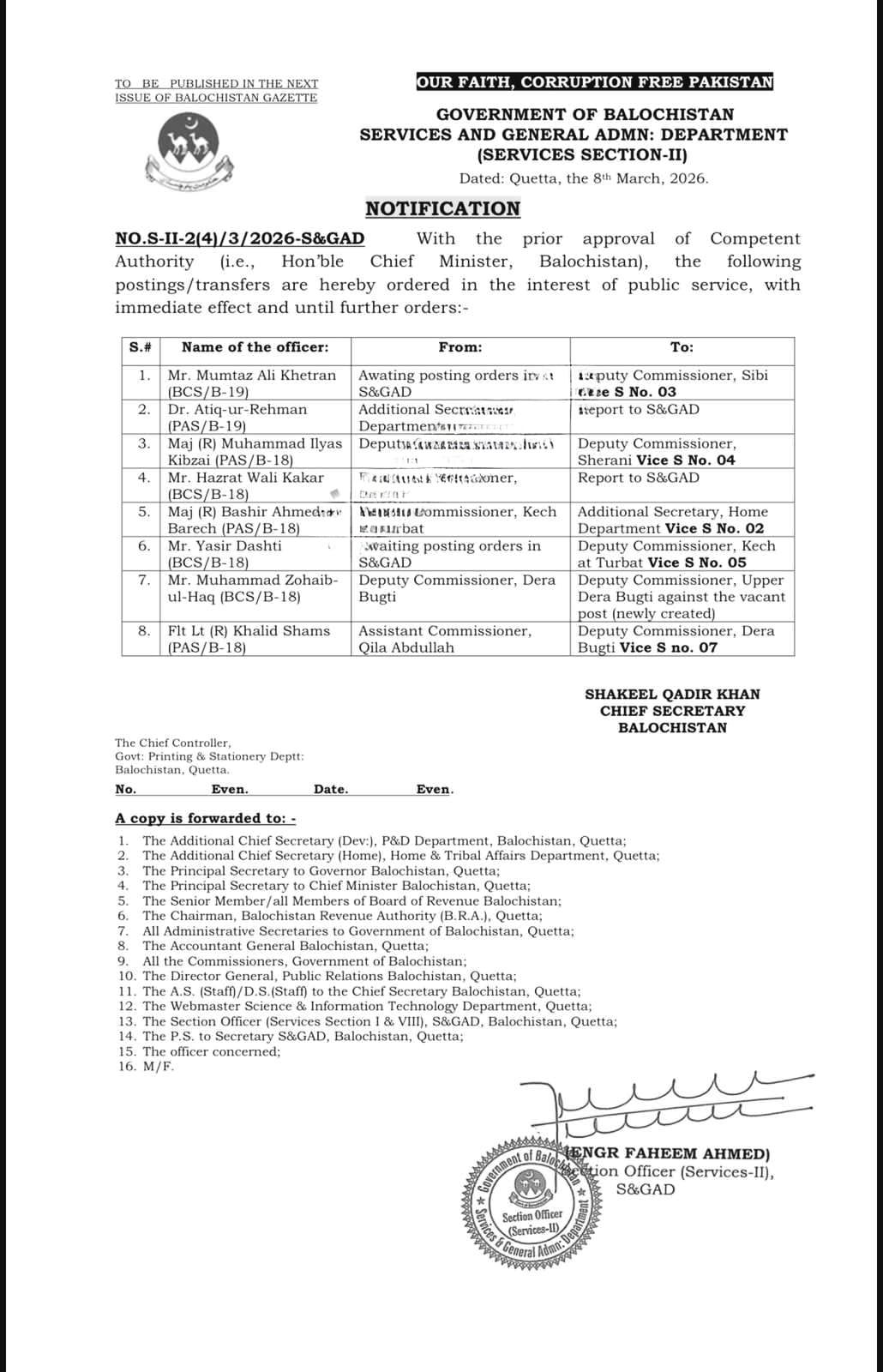 اس کے علاوہ ڈاکٹر عتیق الرحمان اور حضرت ولی کاکڑ کو ایس اینڈ جی اے ڈی میں رپورٹ کرنے کی ہدایت کی گئی ہے۔