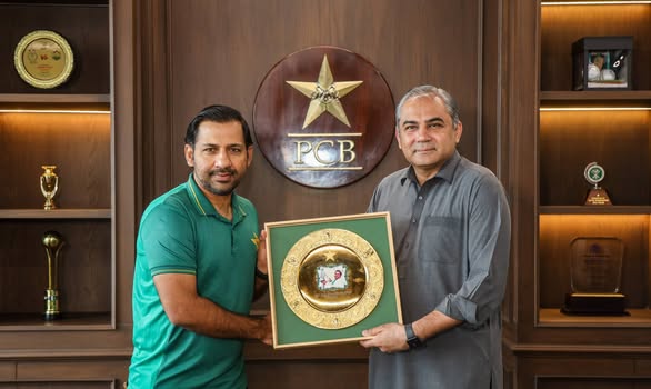 محسن نقوی نے پاکستان کرکٹ کے لیے سرفراز احمد کی گراں قدر خدمات کو سراہا اور انہیں ریٹائرمنٹ پر اعزازی شیلڈ پیش کی۔