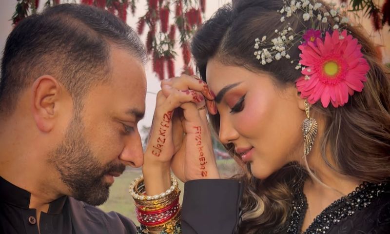 اس موقع پر دولہا دلہن کی تصویر میں دونوں کے ہاتھوں پر مہندی سے ’اعجاز کی فضا اور فضا کا اعجاز‘ بھی لکھا ہوا نظر آرہا ہے۔