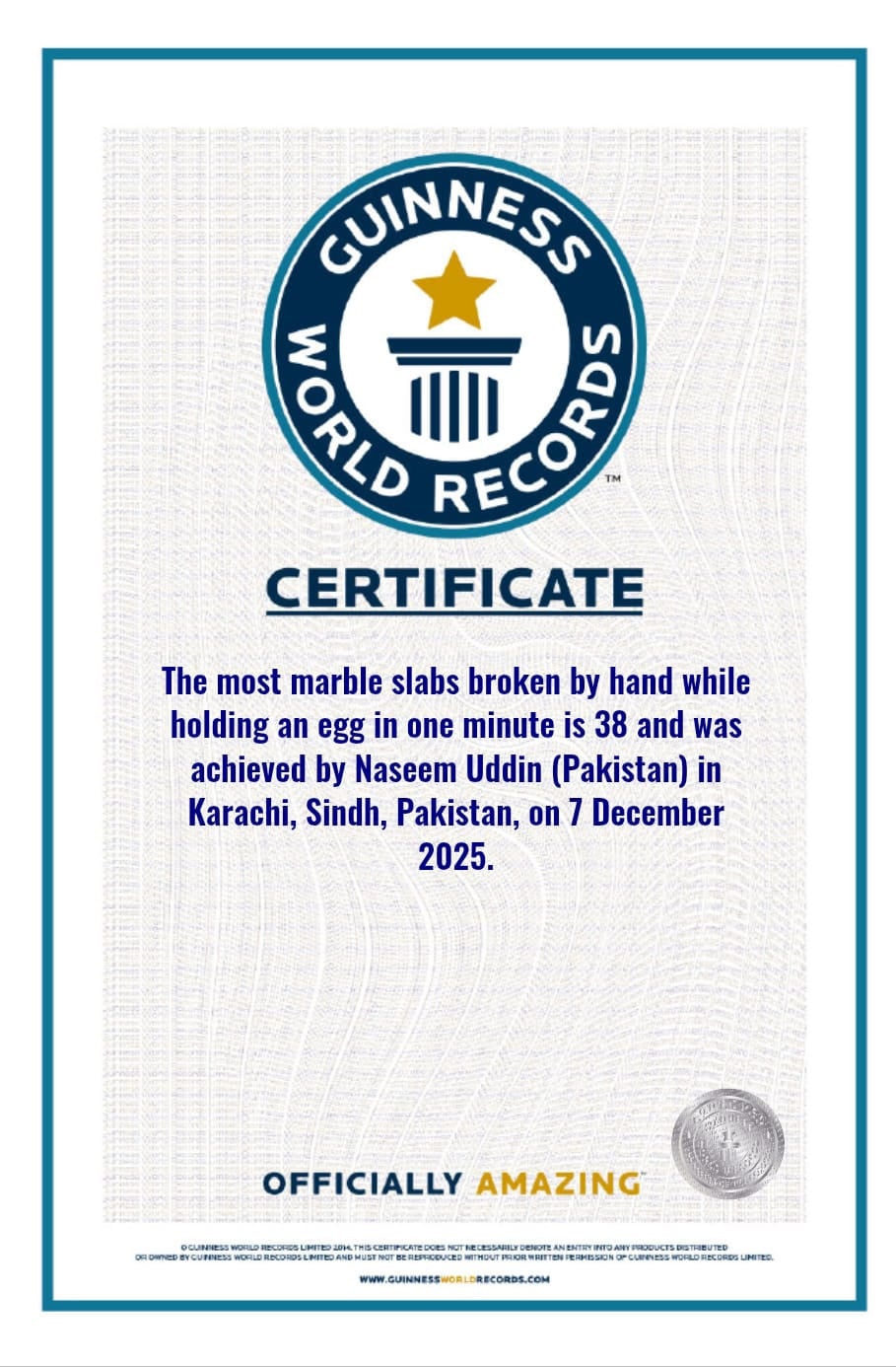 نسیم الدین نےہاتھ میں انڈا پکڑ کر 38 ماربل ٹائلز کو توڑ ڈالا، اس سے پہلے یہ ریکارڈ 30 ماربل ٹائلز توڑنے کا تھا۔