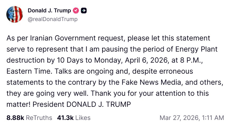 امریکا کا ایران کی توانائی تنصیبات پر حملے 10 دن کیلئے روکنے کا اعلان، فیصلہ ایرانی درخواست پر کیا گیا: ڈونلڈ ٹرمپ