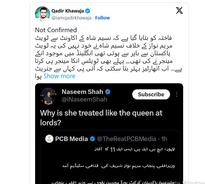 دریں اثنا، صحافی قادر خواجہ نے ذرائع کے حوالے سے نیا دعویٰ کیا ہے کہ یہ ٹویٹ نسیم شاہ نے خود نہیں بلکہ انگلینڈ میں موجود ان کے مینجر نے کی تھی، تاہم ان کا کہنا تھا کہ حکام آئی پی ایڈریس کے ذریعے بہتر تعین کر سکتے ہیں کہ ٹویٹ کہاں سے جنریٹ ہوئی۔
