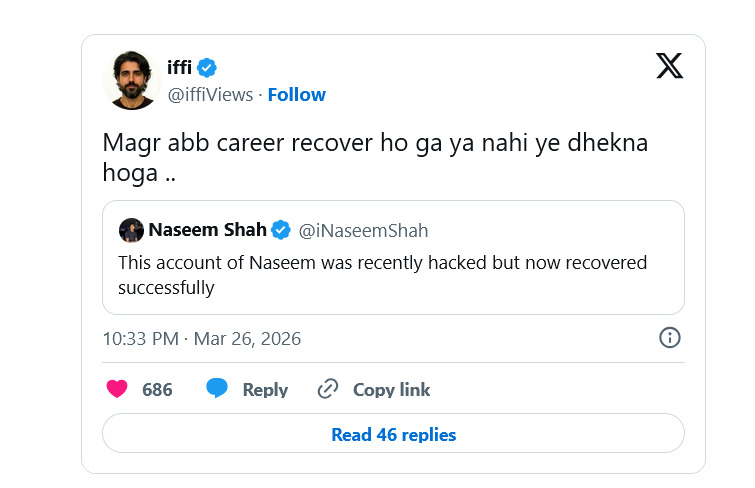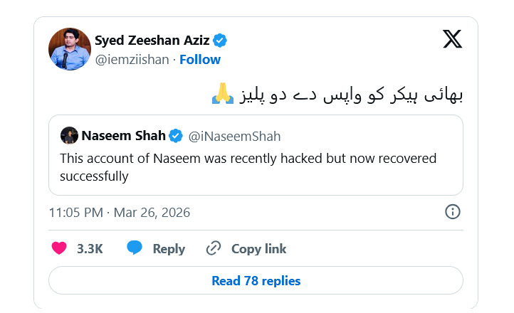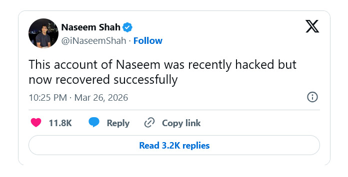 یہ پوسٹ وائرل ہوتے ہی ڈیلیٹ کر دی گئی اور بعد ازاں نسیم شاہ کے اکاؤنٹ پر ایک وضاحت جاری کی گئی کہ ان کا اکاؤنٹ ہیک ہو گیا تھا جسے اب کامیابی سے بحال کرا لیا گیا ہے۔ اس ساری صورتحال پر سوشل میڈیا صارفین اور معروف شخصیات کی جانب سے دلچسپ اور سخت تبصروں کا سلسلہ جاری ہے۔