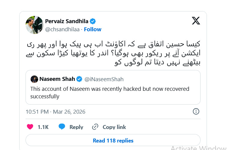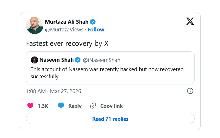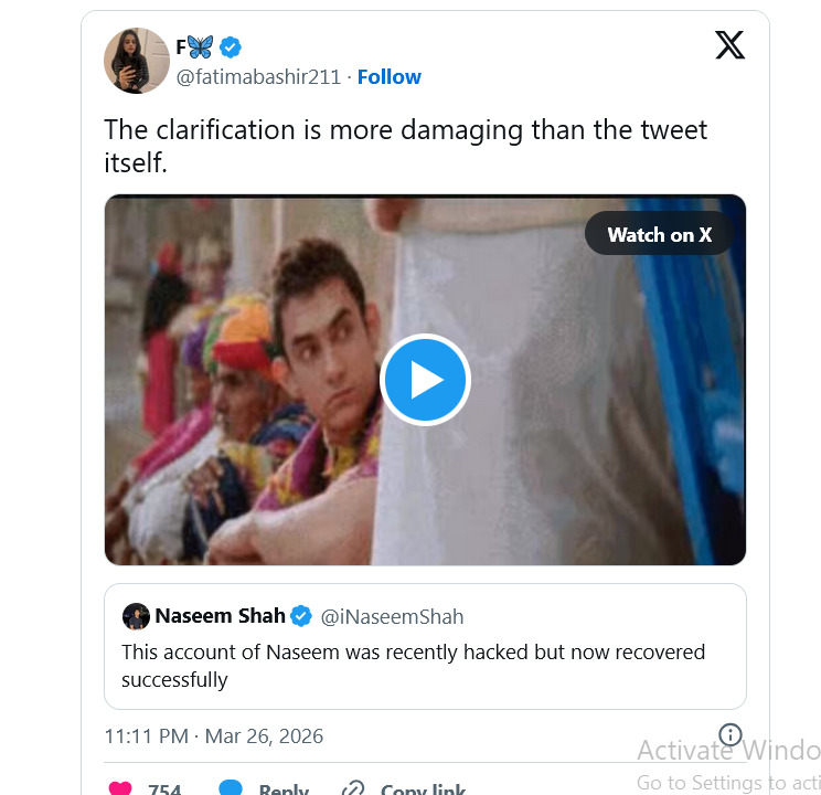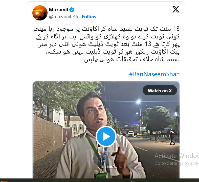 ایک اور صارف نے تکنیکی پہلو کی نشاندہی کرتے ہوئے کہا کہ ٹویٹ 13 منٹ تک موجود رہی، اتنی جلدی ہیک شدہ اکاؤنٹ ریکور کر کے ٹویٹ ڈیلیٹ کرنا ممکن نہیں، اس لیے نسیم شاہ کے خلاف باقاعدہ تحقیقات ہونی چاہئیں جبکہ بعض نے سیاست دان کرکٹرز کو ٹیم سے نکالنے کا مطالبہ بھی کر دیا۔