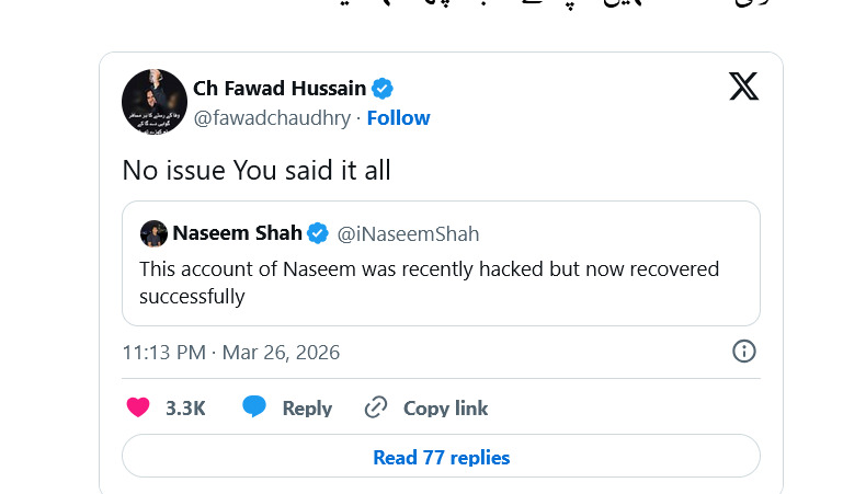 سابق وفاقی وزیر فواد چوہدری نے نسیم شاہ کی ٹویٹ پر تبصرہ کرتے ہوئے کہا کہ ‘کوئی مسئلہ نہیں، آپ نے سب کچھ کہہ دیا’ جبکہ سید ذیشان عزیز نے مزاحیہ انداز میں ہیکر کو اکاؤنٹ واپس دینے کی اپیل کر دی۔