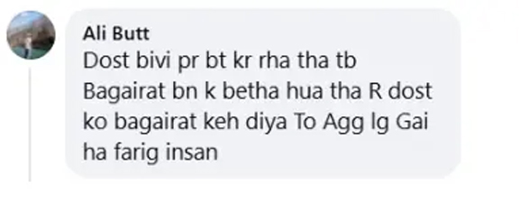 ایک صارف نے لکھا: ”جب آپ کا دوست آپ کی اہلیہ کے بارے میں باتیں کر رہا تھا تب آپ کو برا نہیں لگا، لیکن ’بے غیرت‘ کہے جانے پر آپ سیخ پا ہو گئے۔“