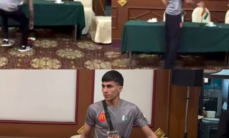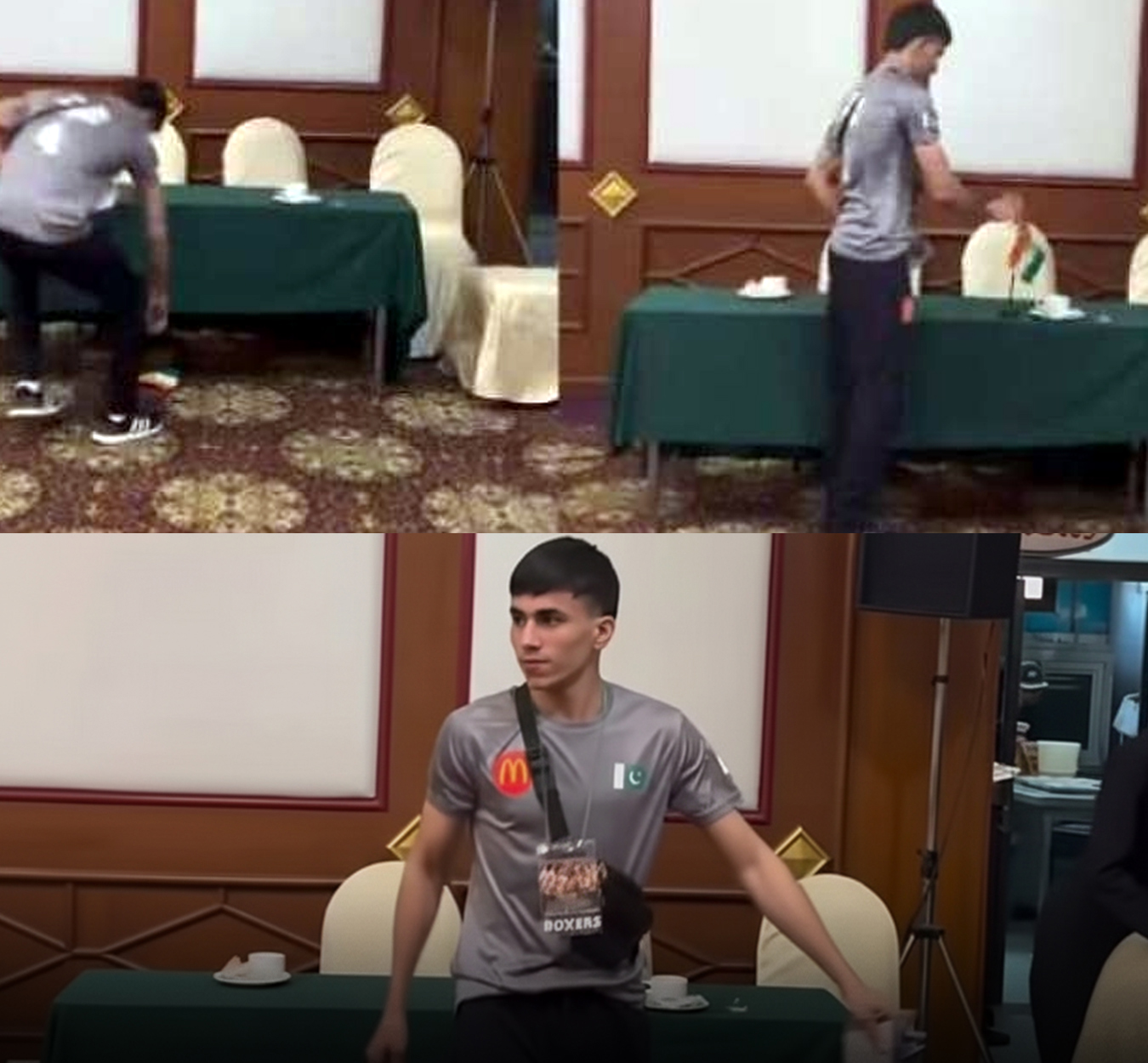 پاکستانی باکسر نے زمین پر گرے ہوئے ہوئے بھارتی پرچم کو اٹھا کر میز پر رکھ دیا جس کی ویڈیو سوشل میڈیا پر تیزی سے گردش کررہی ہے۔