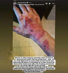 اداکار نے سوشل میڈیا پر شیئر کیے گئے پیغام میں بتایا کہ ایک ایکشن سین کی شوٹنگ کے دوران ریہرسل مکمل ہونے کے باوجود ایک ساتھی اداکار کا جوتا ان کے ہاتھ پر لگ گیا، جس کے نتیجے میں انہیں چوٹیں آئیں اور ہاتھ زخمی ہو گیا۔ اس غیر متوقع حادثے کے باوجود انہوں نے شوٹنگ روکنے کے بجائے اسے جاری رکھنے کا فیصلہ کیا۔