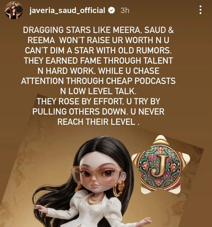 اپنی انسٹاگرام پوسٹ میں جویریہ سعود نے لکھا ہے کہ میرا، سعود اور ریما جیسے ستاروں کو گھسیٹنے سے کسی کی حیثیت نہیں بڑھے گی اور پرانی افواہوں سے کسی ستارے کی چمک ماند نہیں کی جا سکتی۔