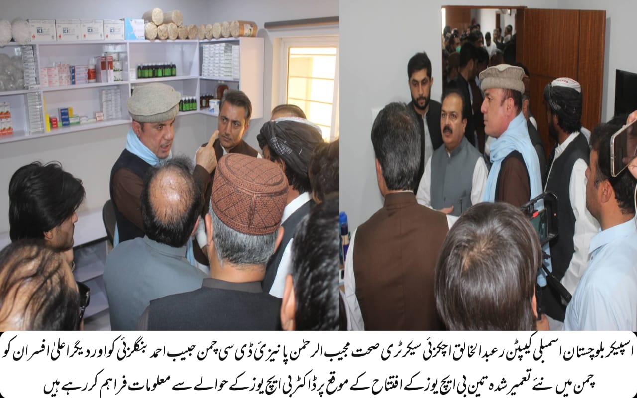 تینوں بی ایچ یوز میں 24 گھنٹے ایمرجنسی سہولیات اور سروسز فراہم کی جائیں گی اور ڈاکٹرز موجود ہوں گے بعد ازاں اسپیکر بلوچستان اسمبلی نے نیو ڈی ایچ کیو ہسپتال چمن کا تفصیلی دورہ کیا جہاں انھوں نے ہسپتال کی مختلف شعبہ جات جس میں لیبارٹری آپریشن تھیٹر میڈیسن وارڈز شعبہ حادثات اور دیگر ضروری سہولیات کا باریک بینی سے جائزہ لیا اور مریضوں سے حال احوال پوچھا انہوں نے ڈاکٹروں اور سٹاف کی حاضریاں چیک کیں اور ہسپتال کی مجموعی صورتحال صفائی ستھرائی اور حفظان صحت کے اصولوں کا جائزہ لیا اس موقع پر ڈی ایچ او چمن ڈاکٹر نوید بادینی اور ایم ایس نیو ڈی ایچ کیو ہسپتال چمن ڈاکٹر اویس نے اسپیکر بلوچستان اسمبلی اور سیکرٹری صحت مجیب الرحمٰن کو ہسپتال کے حوالیسے تفصیلی معلومات فراہم کی گئیں اس موقع پر اسپیکر بلوچستان اسمبلی اور سیکرٹری صحت نے کہا کہ مریضوں کی علاج و معالجہ اور انھیں بہتر طبی سہولیات کی فراہمی کو یقینی بنائیں اور مریضوں کی جسمانی اور نفسیاتی سکون و اطمینان کیلئے ڈاکٹرز مریضوں سے خندہ پیشانی سے پیش آئیں انہوں نے کہا کہ طب کے شعبے میں ڈاکٹروں اور سٹاف کی غفلت لاپرواہی غیر حاضری اور سستی سے مریضوں کی جان کو خطرات لاحق ہو سکتے ہیں لہٰذا ڈاکٹرز پیرامیڈیکس اور تمام سٹاف اپنی حاضریوں کو یقینی بنائیں اور وقت کی پابندی کریں تاکہ مریضوں کی بروقت علاج و معالجہ کو یقینی بنایا جائے بی ایچ یوز کے افتتاحی موقع پر علاقہ مکینوں نے اسپیکر بلوچستان اسمبلی کی اس اقدام کو خوش آئند قرار دیتے ہوئے انھیں سپیکر بلوچستان اسمبلی کی عوام دوستی قرار دیا عوام نے خوشی کا اظہار کرتے ہوئے کہا کہ صحت کے شعبے میں یہ پیش رفت علاقے کی بہتری اور عوامی فلاح کیلئے ایک سنگِ میل ثابت ہوگی عوامی حلقوں نے کیپٹن (ر) عبدالخالق خان اچکزئی کے اس اقدام پر انہیں خراجِ تحسین پیش کرتے ہوئے امید ظاہر کی کہ ضلع چمن کی ترقیاتی کاموں کا یہ سلسلہ آئندہ بھی جاری رہے گا۔