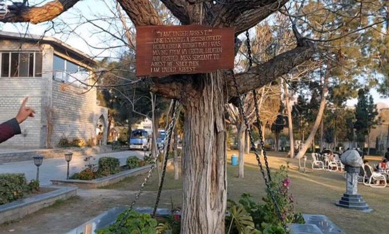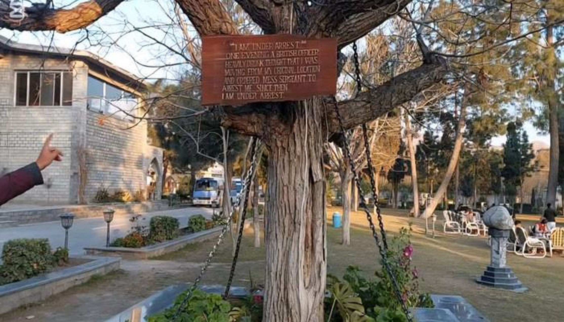 اس درخت پر انتظامیہ کی جانب سے نصب بورڈ میں تحریر ہے ‘مجھے گرفتار کرلیا گیا ہے’، برطانوی دور حکومت میں ایک شام نشے کی حالت میں موجود ایک فوجی افسر کو لگا کہ میں اپنی اصل جگہ سے ہل رہا ہوں ہے جس کے بعد اس نے مجھے گرفتار کرنے کا حکم دیا اور تب سے میں گرفتار ہوں۔
