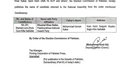 حلقہ این اے 251: الیکشن کمیشن ، پشتونخوا نیپ کے چیئرمین خوشحال خان کاکڑ کی کامیابی کا نوٹیفکیشن جاری